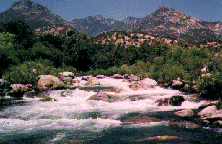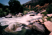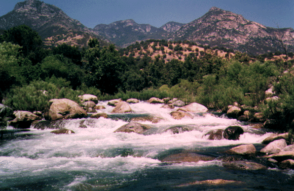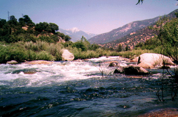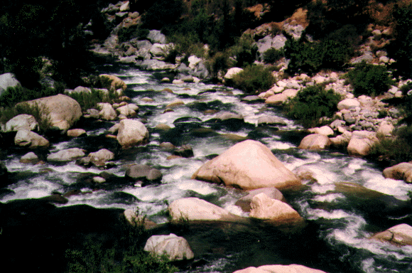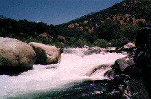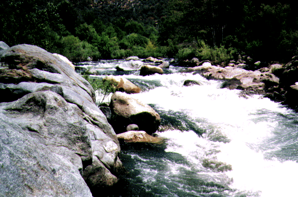 This section is the Classic Kaweah run. The description starts at the traditional historical Put in at Pumpkin Hollow Bridge even though the put in at the bridge has been blocked of in the spring of 1994. Put in below Headwall where the highway comes adjacent to the river. It's best to run this section with someone familiar with the run as some drops are hard to scout and the river splits in several places. The route is usually to the leftmost channel. This section is still runnable below zero on the gauge (less than 400 cfs) although it becomes quite technical and more rocks are visible than water.
