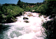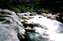 300 yards of real action. Run top anywhere but eddy right or left at large rocks center and right. Ferry center and exit center or left. Right side ends in sieve at low flows but OK at high flows. At flows above 3.0 ft this rapid has serious penalty points for anything other than the perfect line. A very difficult scout from river left. Portage is impossible in rafts.